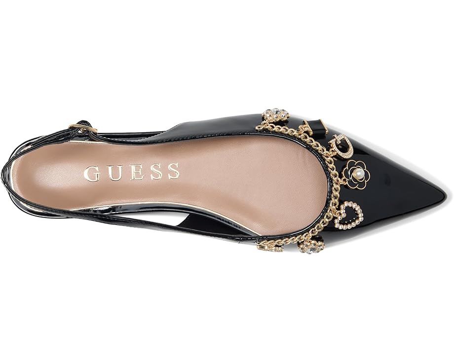 • Туфли Guess Daisee — это простой силуэт с открытой пяткой, дополненный модными нотками. Они украшены цепочкой на переднем носке и очаровательными подвесками Guess. Верх из резины, подкладка из синтетического каучука, острый носок, застежка на пряжке, низкий силуэт и плоская пятка.