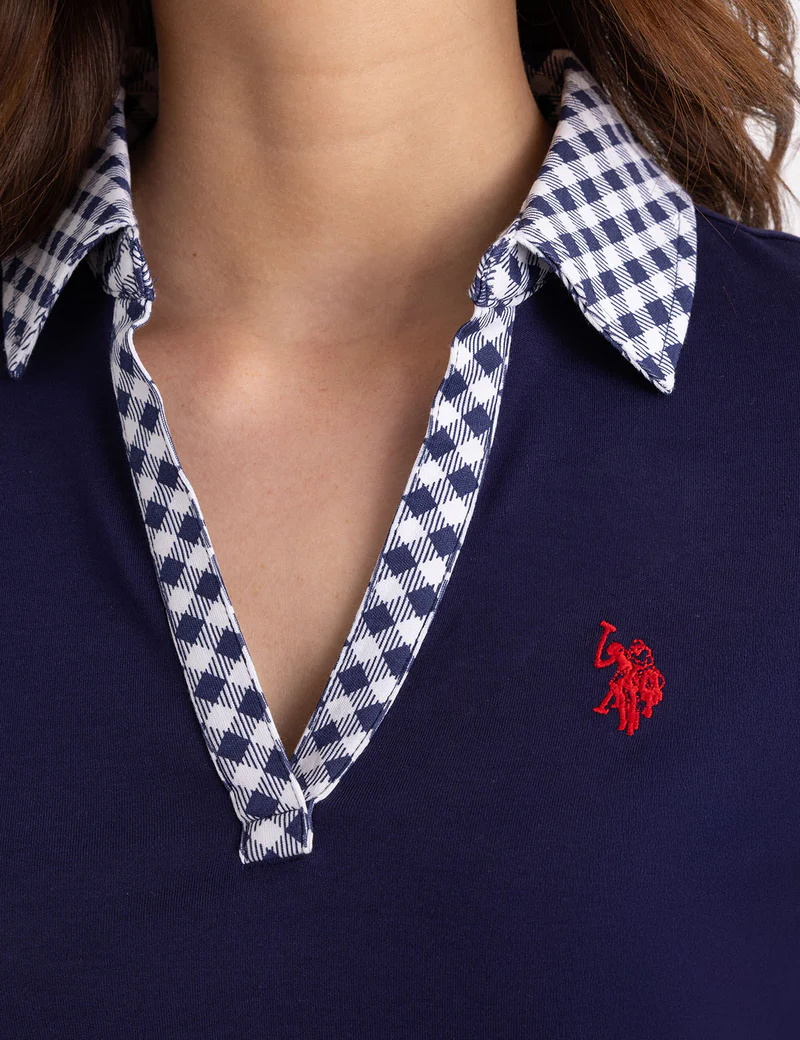 Платье-поло с разрезом на горловине и воротником в клетку гингем.