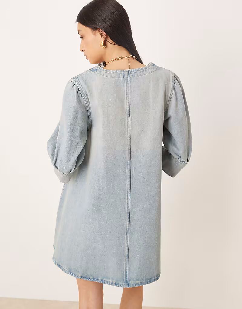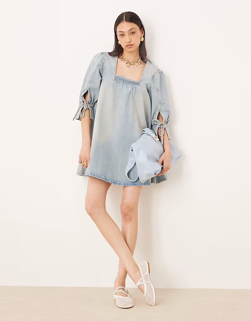 Мини-платье из денима ASOS DESIGN в стиле бохо с завязками на манжетах