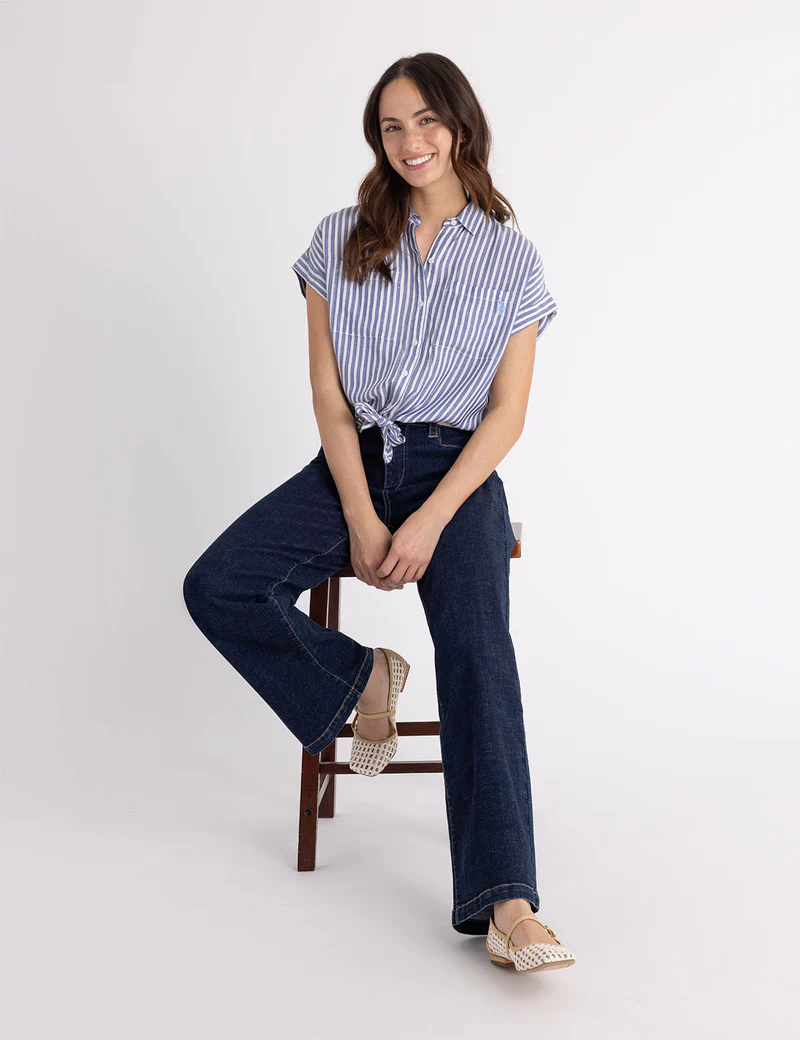 Эта полосатая рубашка «летучая мышь» с короткими рукавами, непринужденно и повседневно, отличается свободным силуэтом и классической застежкой на пуговицы спереди.