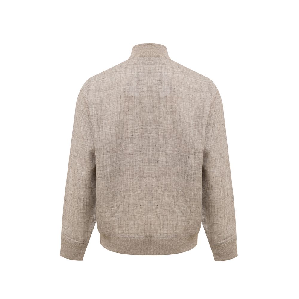 Из бежевого льна, застежка на коричневые пуговицы, два передних кармана на пуговицах, трикотажный воротник-стойка и эластичный пояс.