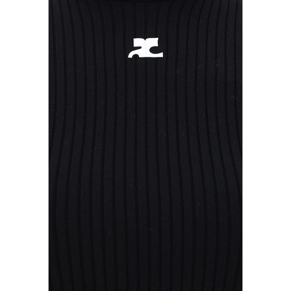 Топ от Courrèges, короткий рукав, высокая расцветка, вышитый контрастный логотип бренда спереди, сплошной ребристый рисунок, монохромный узор, облегающий крой.