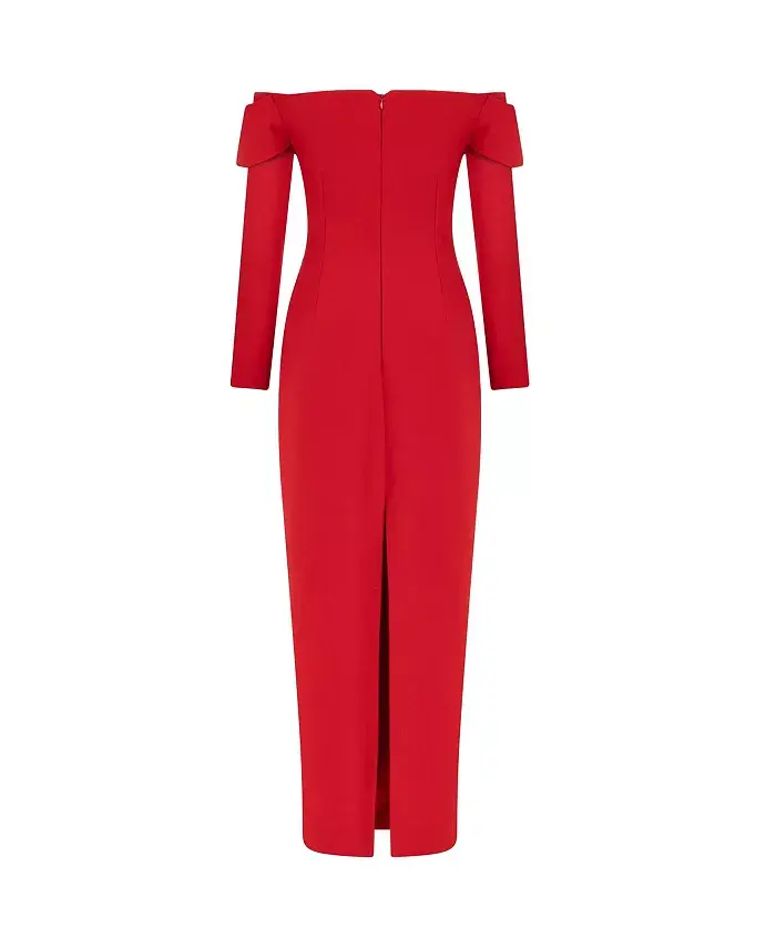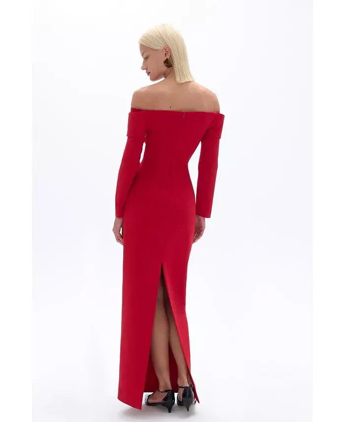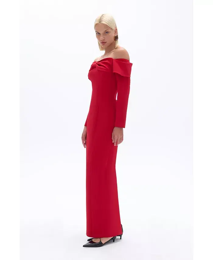 Это облегающее, цельнокроеное макси-платье с открытыми плечами, застежкой-молнией на спине и бантом.