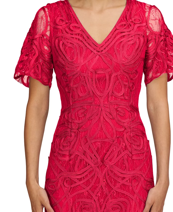 Отделка сутажем поверх сетчатого наложения придает этому платью миди JS Collections дополнительную текстурную привлекательность. Рукава-крылышки и расклешенный подол завершают образ.