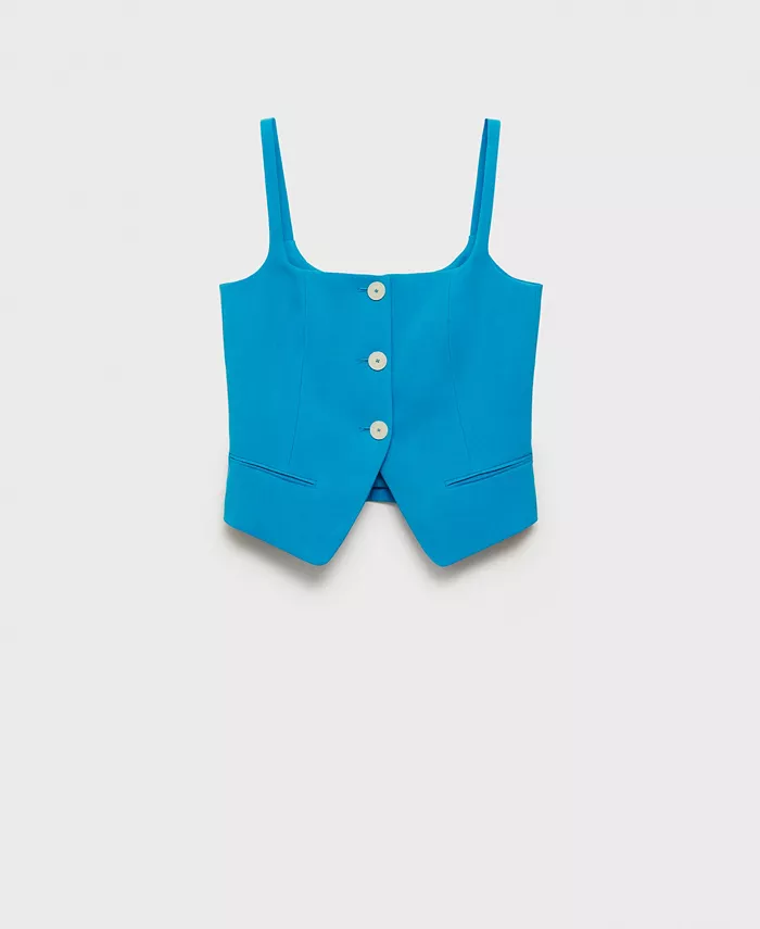 Изысканный и современный, жилет Suit Waistcoat with Open Back от Mango делает заявление. Этот жилет имеет прямой и укороченный дизайн с тонкими бретелями, открытую спину, застежку на пуговицы спереди, два передних прорезных кармана и внутреннюю подкладку.