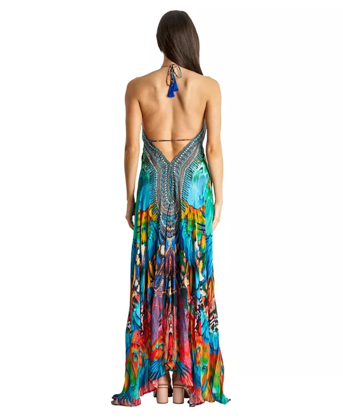 Это потрясающее платье с завязками на шее и разноцветным узором отличается красочным принтом и завязками с кисточками.