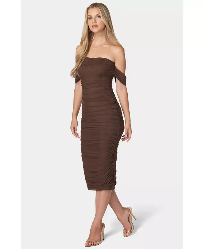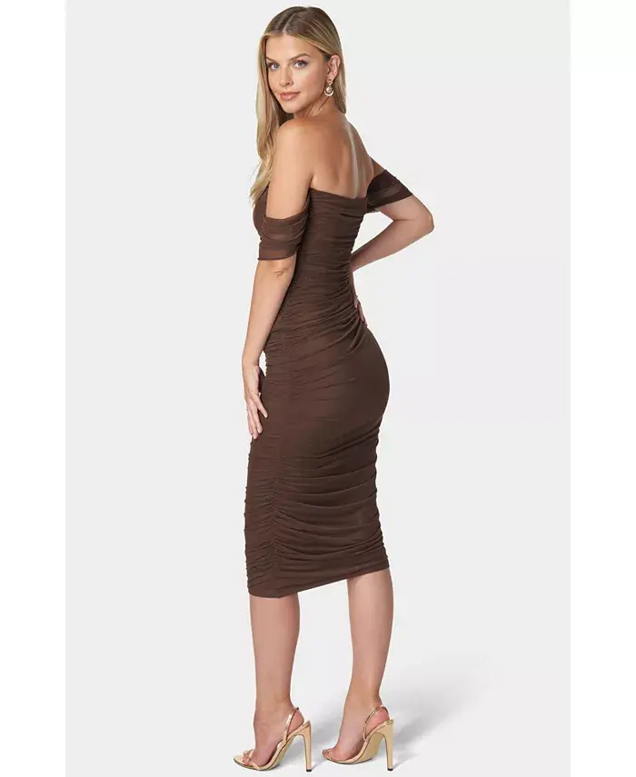 Женское платье-миди со сборками от Bebe гармонично сочетает в себе элегантность и комфорт, что делает его незаменимым дополнением к любому модному гардеробу.