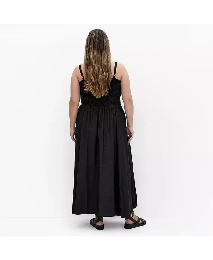 Регулируемые лямки, присборенная грудь до талии, затягивающийся шнурок по центру спереди, боковые карманы, свободная юбка, подол макси, без подкладки. Носите с туфлями на каблуках с ремешками и смелым ожерельем.