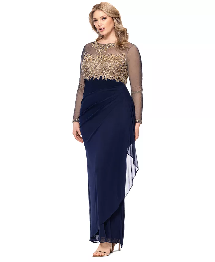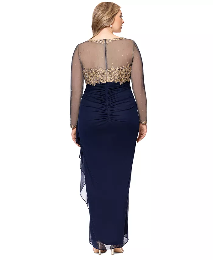 Сборки по бокам юбки обеспечивают дополнительную защиту этому платью больших размеров от Xscape, великолепно расшитому и с длинными рукавами из искусственной сетки.