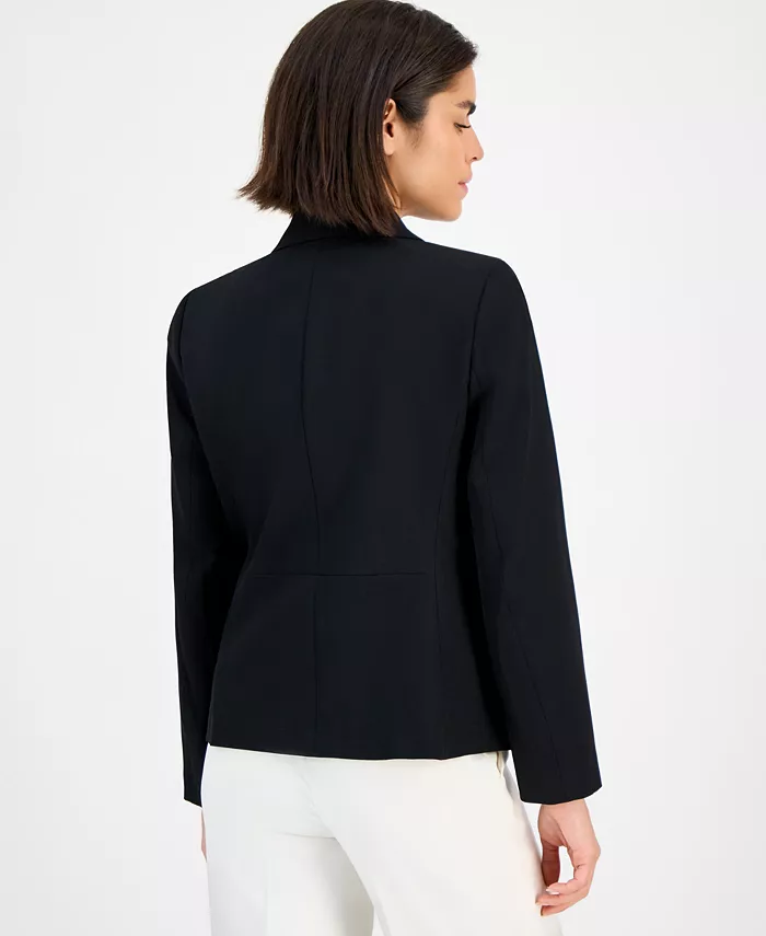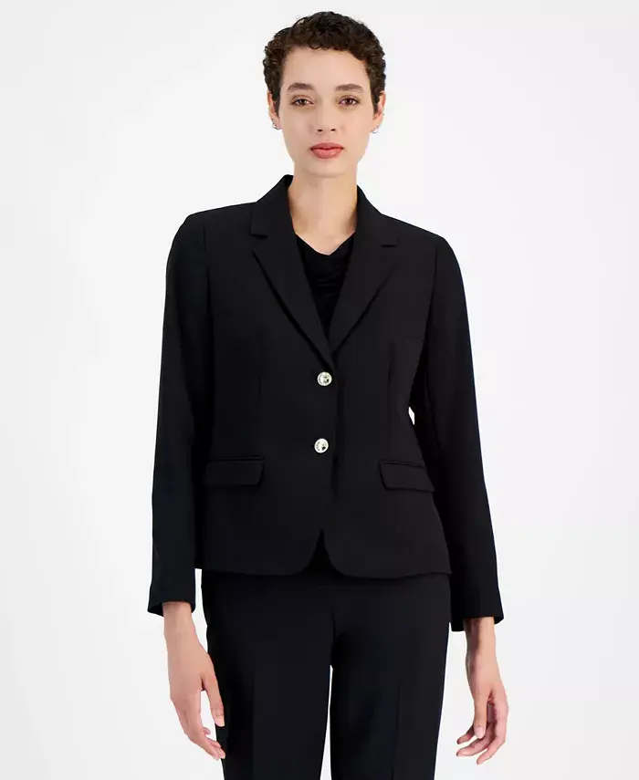 Блестящие пуговицы завершают изящные классические линии пиджака с зубчатым воротником от Kasper — универсального базового предмета гардероба, ориентированного на карьеру.