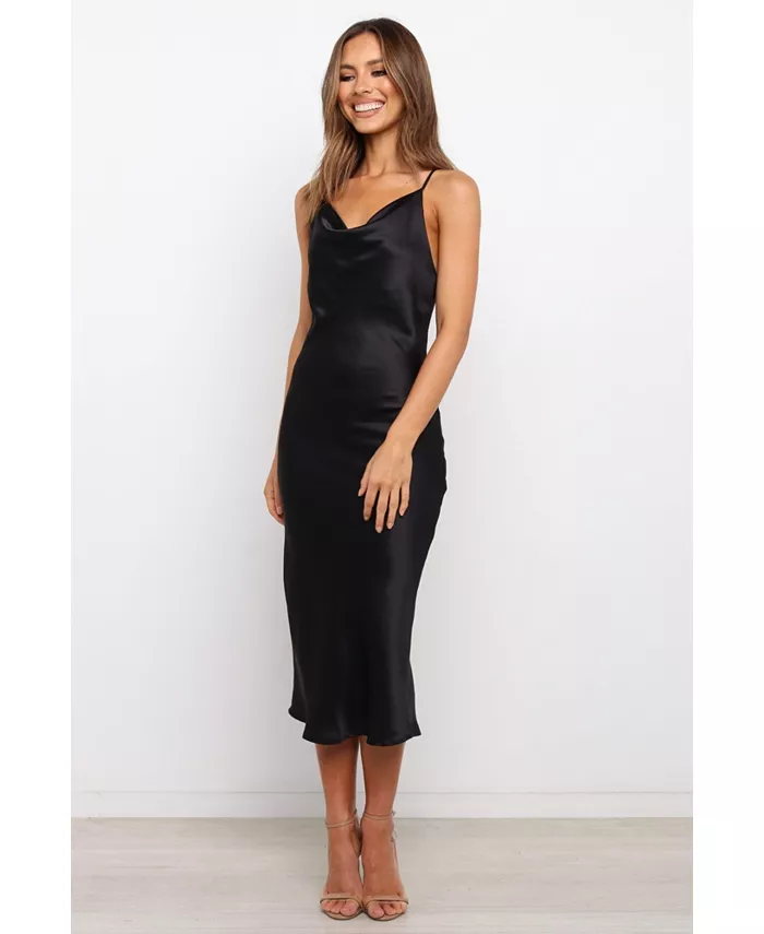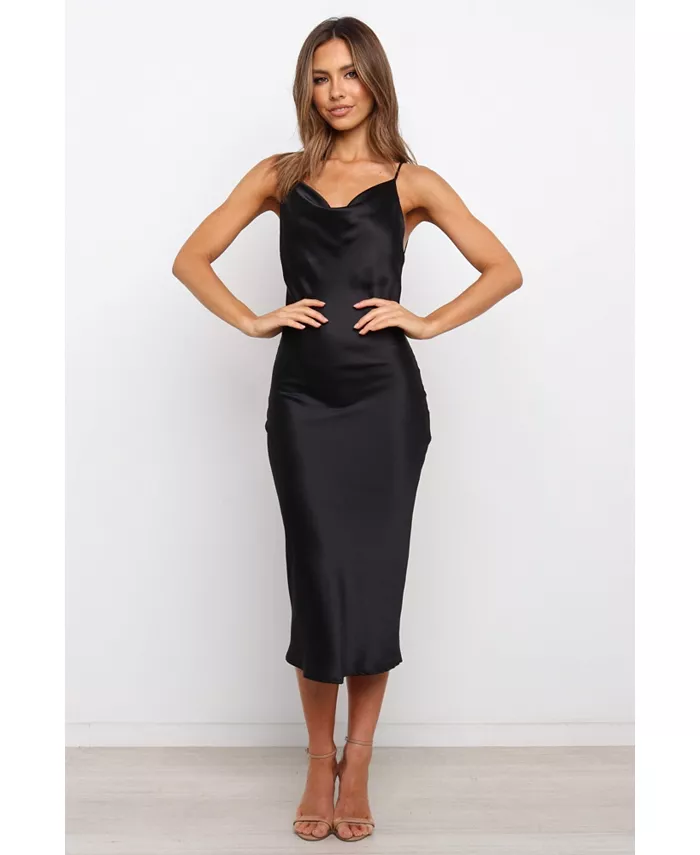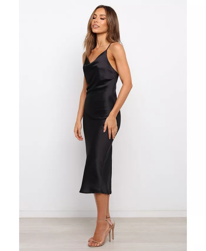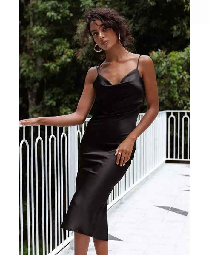 Это платье-хомут длиной миди — идеальное сочетание стиля и изысканности. Его тонкие регулируемые бретели обеспечивают идеальную посадку, а разрез на спине добавляет женственности вашему образу. Шелковистая атласная отделка гарантирует, что вы будете сиять всю ночь!