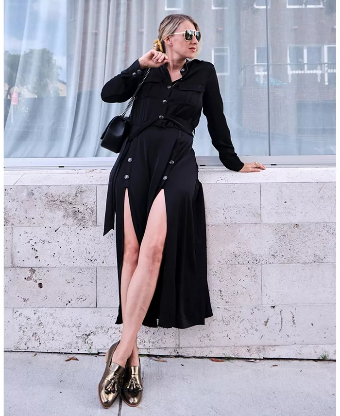 Элегантно ошеломляющее, платье-рубашка Lover To Lover следует классическому стилю милитари в ткани, похожей на шелк. С длинными рукавами и подолом, высокие разрезы делают еще более смелым заявление, чем декоративные металлические пуговицы.