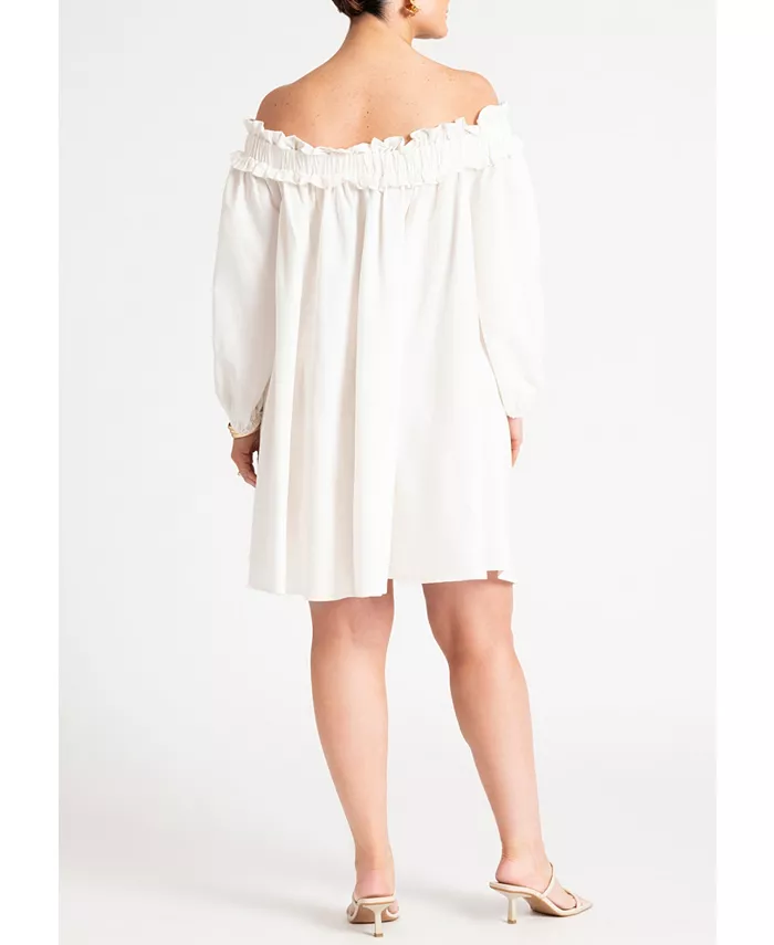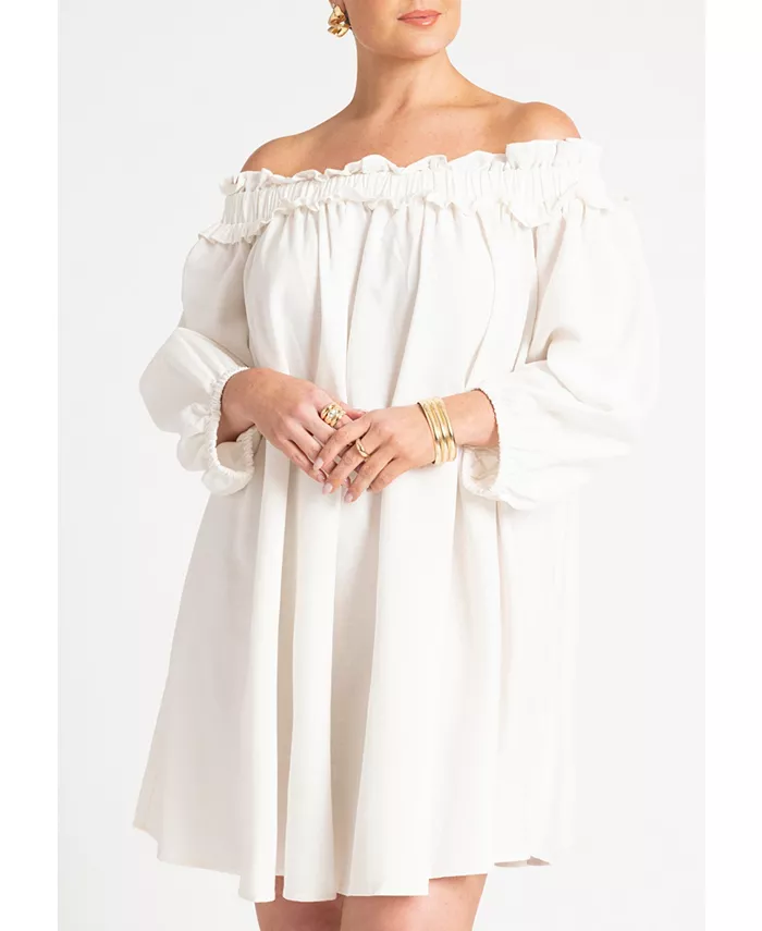 Это мини-платье с открытыми плечами от ELOQUII предлагает расслабленный силуэт из легкой льняной смеси, но длина мини поднимает его на ступеньку выше. Повседневный шикарный летний образ.