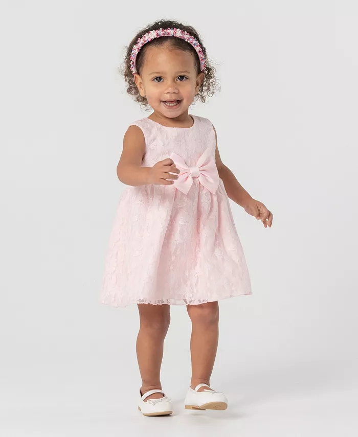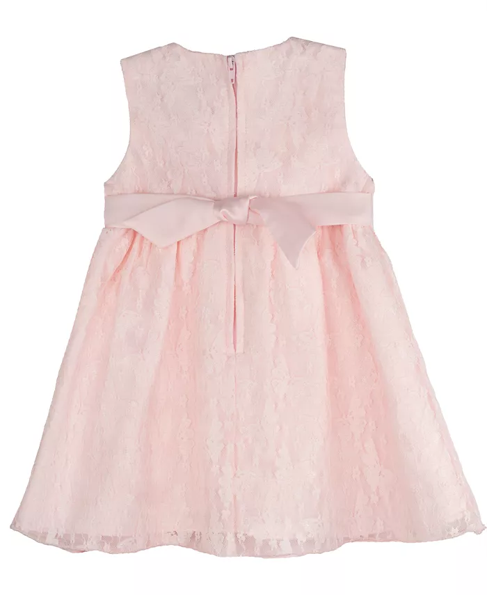 Платье для торжественных случаев без рукавов для девочки, выполненное из кружева с цветочным узором, с атласной отделкой на талии и бантом по центру.