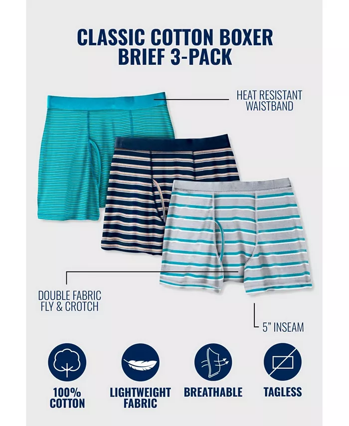 Лучшие вещи идут в тройках. Эти трусы-боксеры из 100% хлопка с этикеткой без бирки, не вызывающей зуда, и большими проймами для ног для ежедневного комфорта. Начните свой первый слой правильно. Свободный крой 1½" термостойкий, открытый эластичный пояс 5" внутренний шов. Двойная ткань ширинки и промежности. Этикетка без бирки 100% хлопок. Машинная стирка импортируется