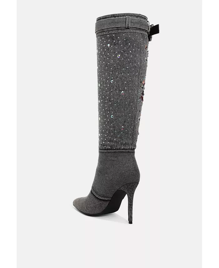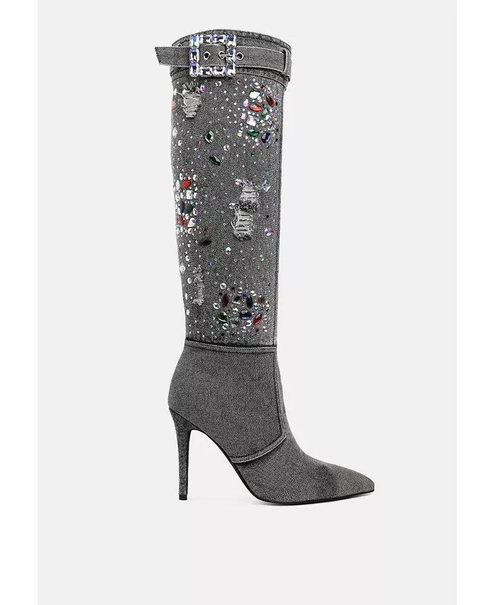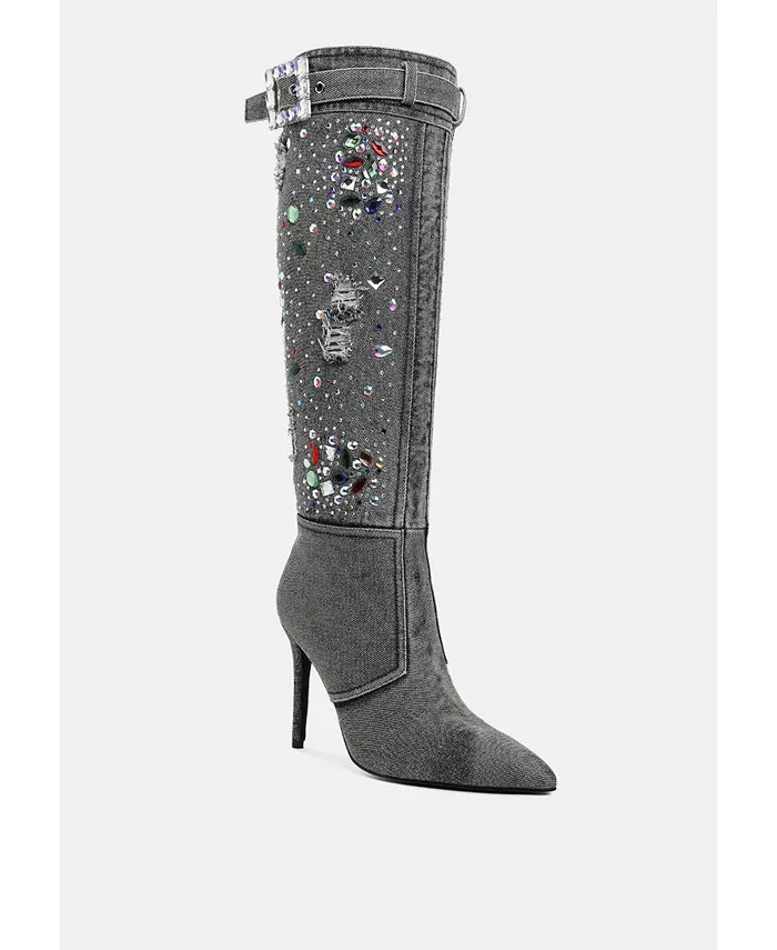 Джинсовые сапоги — это эксцентричное произведение искусства с разноцветными каменными украшениями, деталями сбруи и потертостями. Максималистское изделие, сапоги имеют панельные детали и шпильки, которые придают им авангардную эстетику.