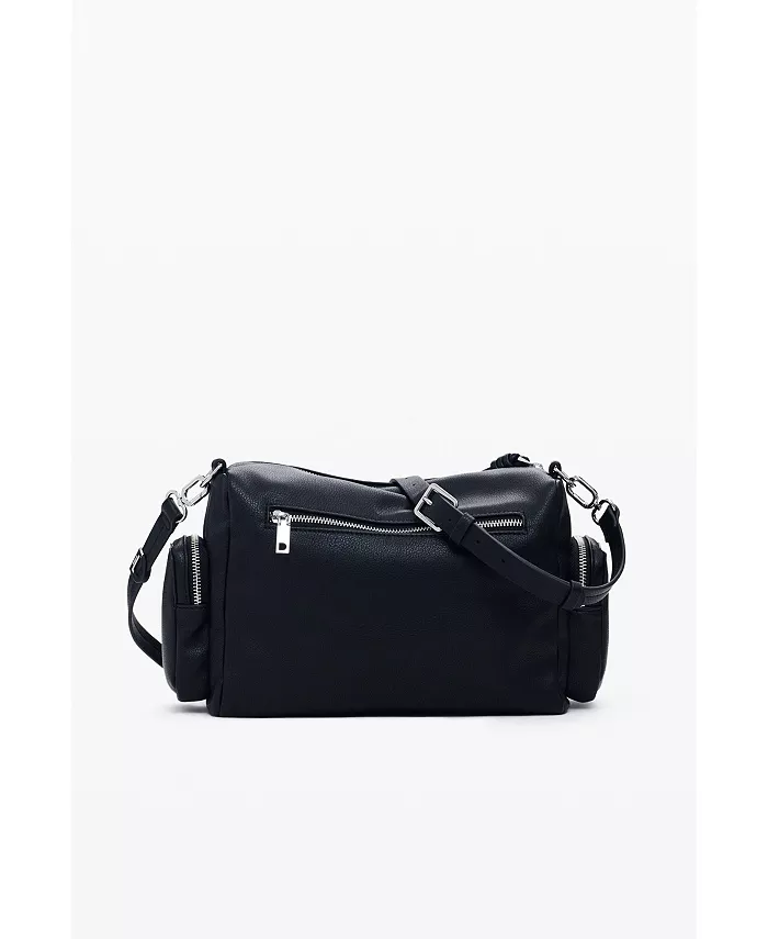 Сумка в стиле боулинга из искусственной кожи с внешними карманами, сменными ручками и логотипом с 3D-эффектом в однотонном цвете.