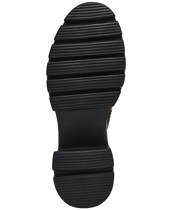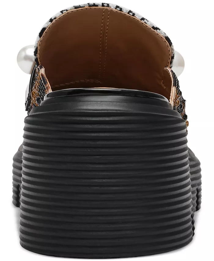 Классический образ мокасин становится дерзким благодаря сочетанию узора «гусиная лапка», анималистичного принта, золотистых бусин и искусственного жемчуга, и все это в силуэте мюлей Haizel с рифленой подошвой и открытой спинкой от Betsey Johnson.