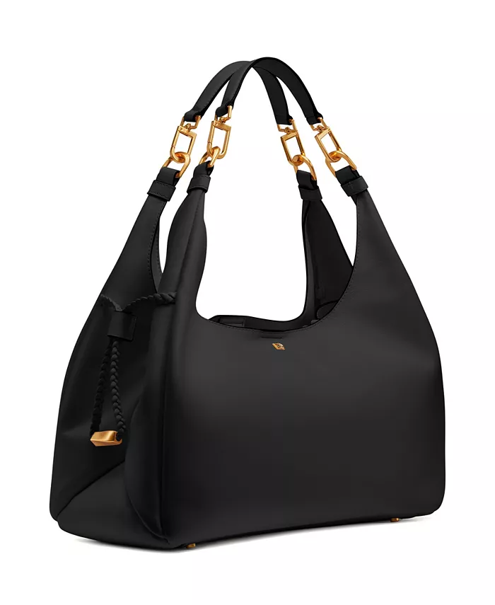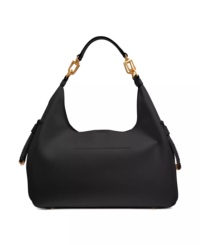 Эта сумка-хобо от Donna Karan, выполненная из кожи и рассчитанная на загруженные дни, украшена декоративными плетеными шнурками по бокам и яркой золотистой фурнитурой, придающей изделию изысканный вид.