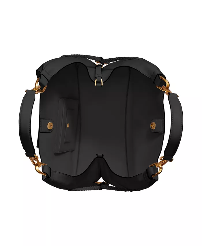 Золотистая фурнитура, декоративные завязки по бокам и металлический логотип спереди.