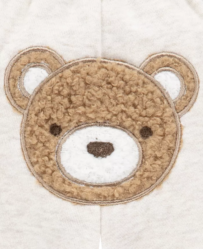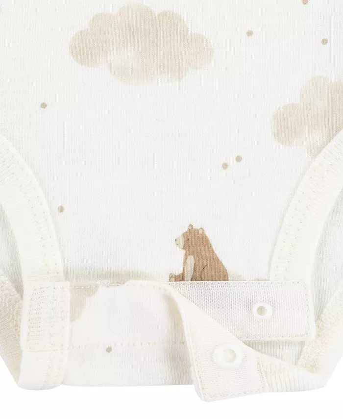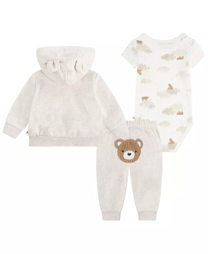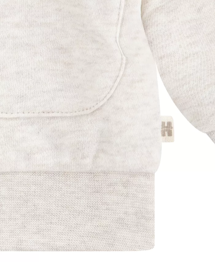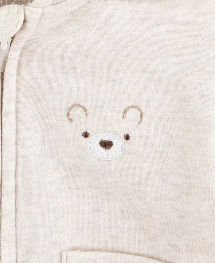 Укутайте своего малыша в Huggies. Куртка из французского терри имеет длинную молнию, два кармана и очаровательный капюшон с милыми ушками. Боди из хлопкового рубчика с короткими рукавами и принтом по всей поверхности идеально сочетается с мягкими брюками на эластичном поясе.