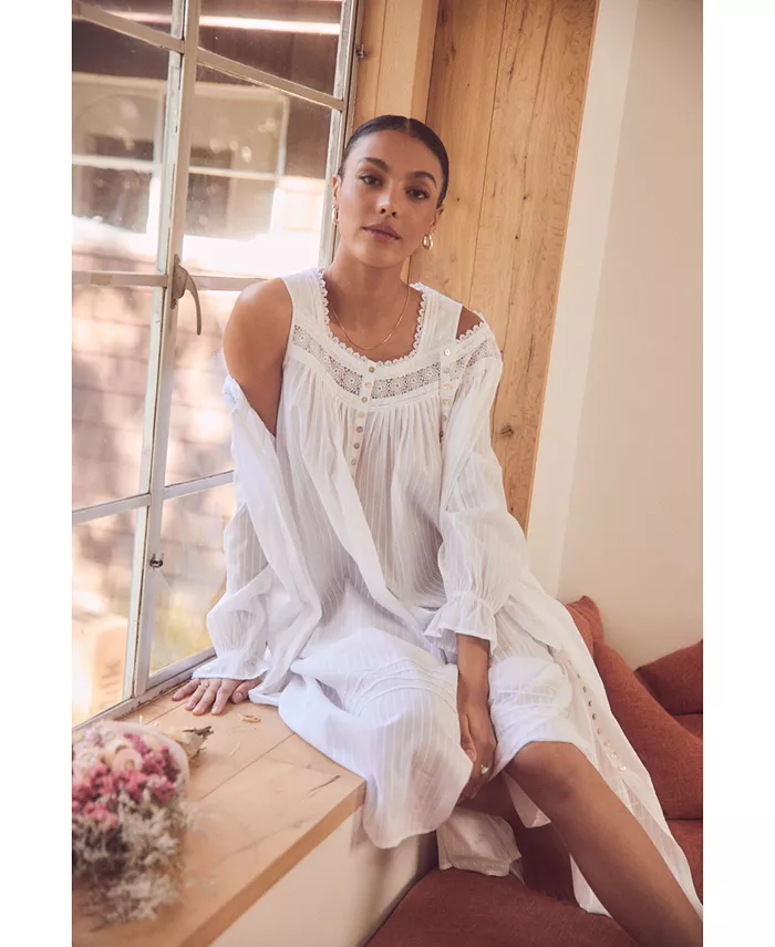 Эта ночная рубашка из 100% хлопка, имеющая чистый и классический вид, выполнена в изящной полоске кареточного плетения, дополнена венецианским кружевом на бретелях и юбке, защипами и планкой с пуговицами из ракушки акойя.