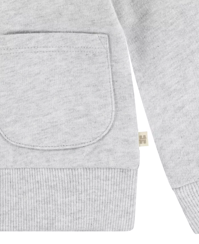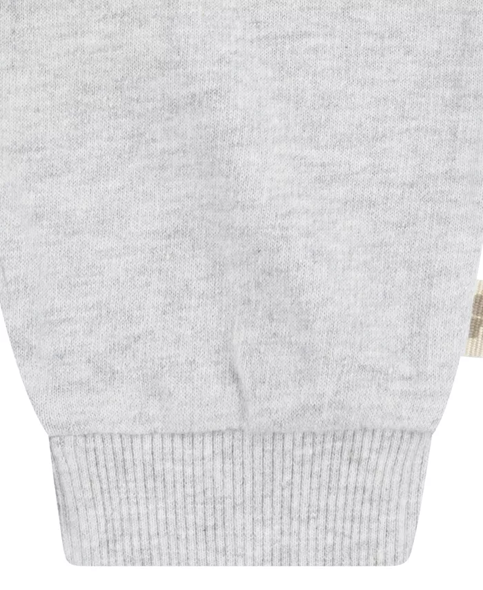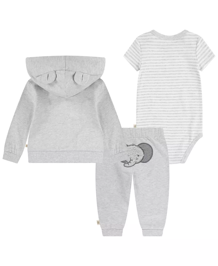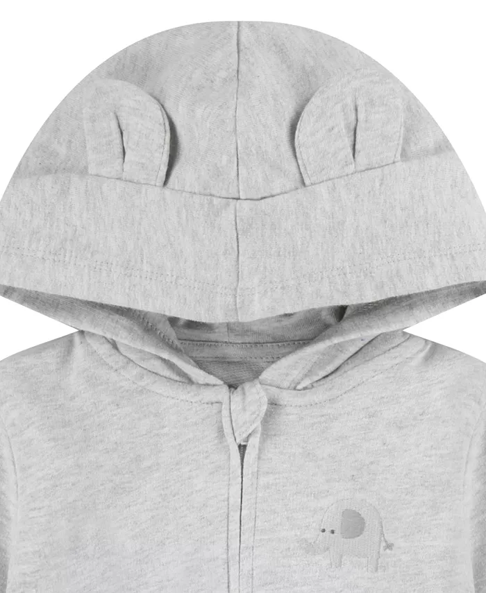 Укутайте своего малыша в Huggies. Куртка из французского терри имеет длинную молнию, два кармана и очаровательный капюшон с милыми ушками. Боди из хлопкового рубчика с короткими рукавами и принтом по всей поверхности идеально сочетается с мягкими брюками на эластичном поясе.