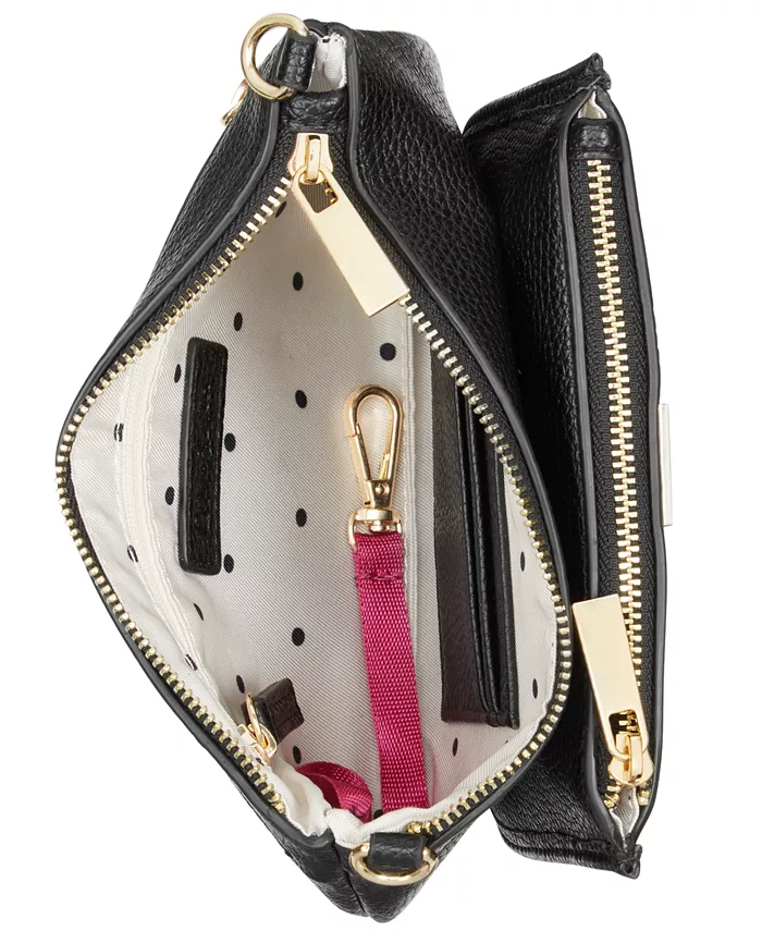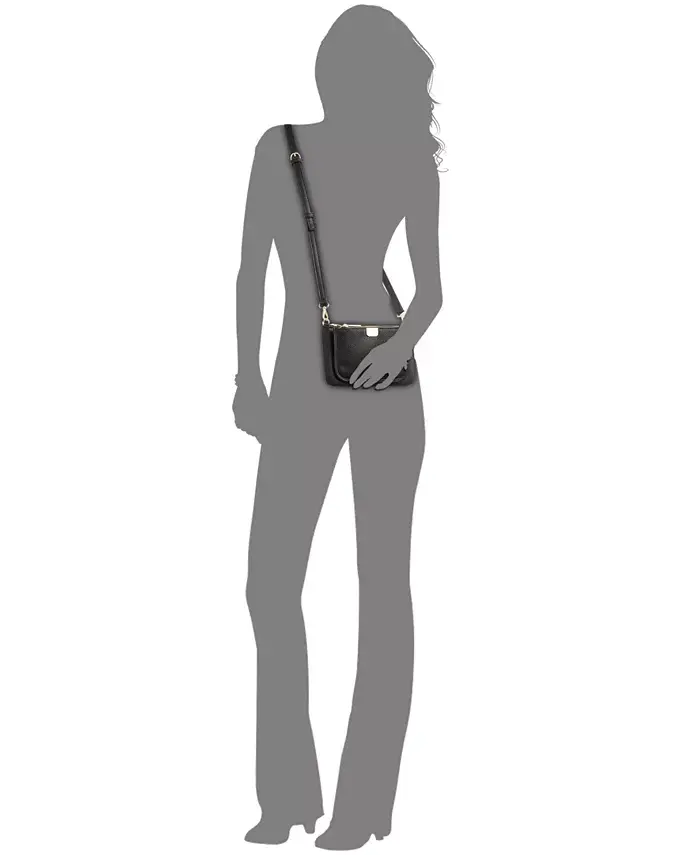 Сумка небольшого размера; 7-5/8"Ш x 5-1/8"В x 1"Г (ширина измеряется по дну сумки); вес около 0,66 фунта Силуэт основан на модели ростом 5 футов 9 дюймов. Регулируемый ремень длиной 23 дюйма Застежка-молния Фурнитура золотистого цвета; внешний карман на молнии; внутренний карман на молнии и отделения для карт с карабином для ключей 100% ПУ; подкладка: 100% полиэстер Чистка местами