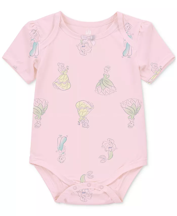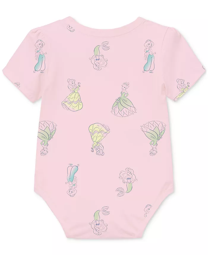 Боди: круглый вырез с бантом; короткие рукава; плечи на бретелях; кнопки внизу; принт «Принцессы» по всей поверхности.