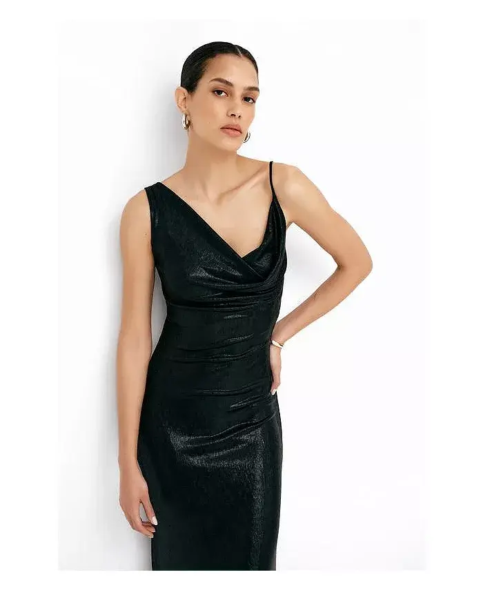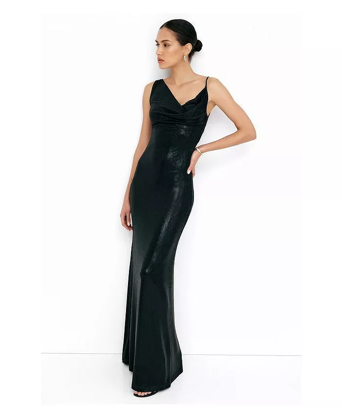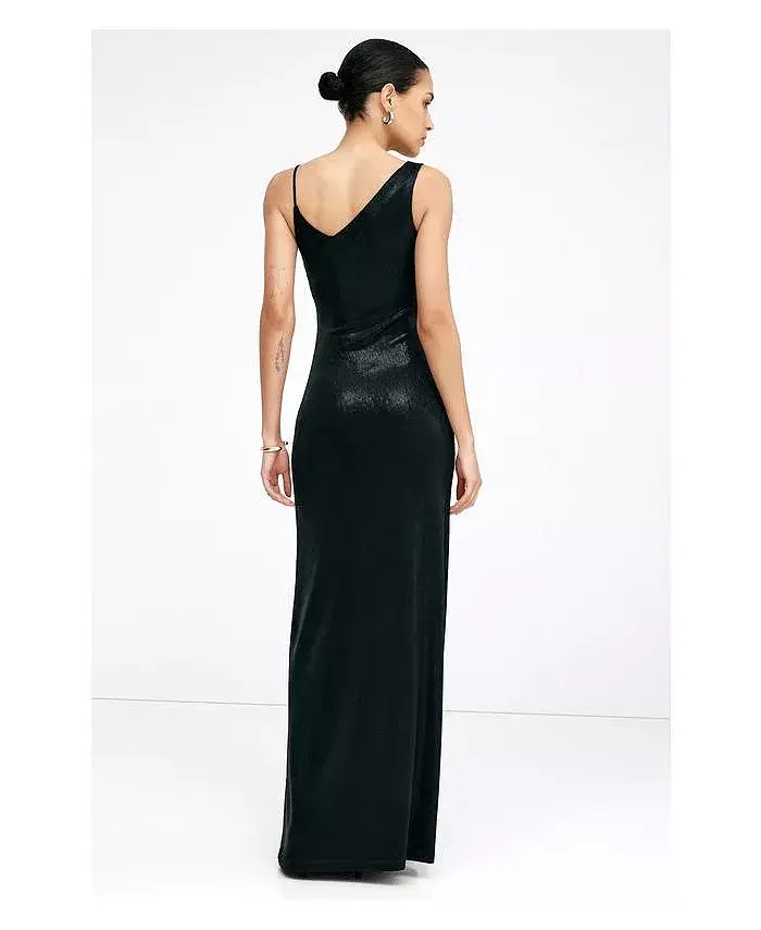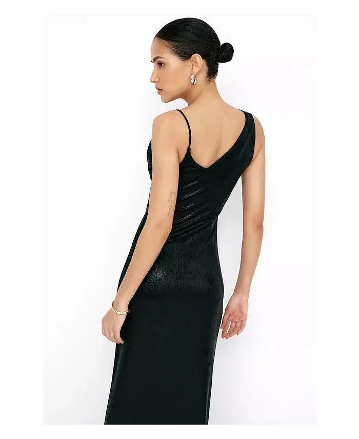 Это не было бы празднованием без платья Liberty Metallic, макси-силуэта от Marcella, в котором сочетаются очарование и таинственность. Ее облегающий лиф отмечен асимметрией на вырезе и бретелях и элегантно переходит в струящуюся юбку-колонну. Из европейской эластичной трикотажной ткани с металлическим покрытием.