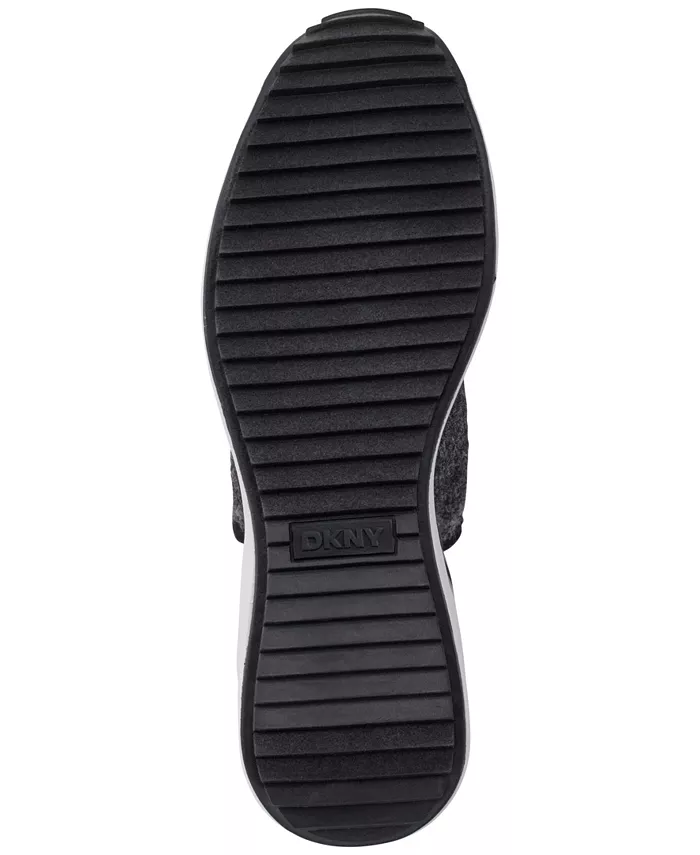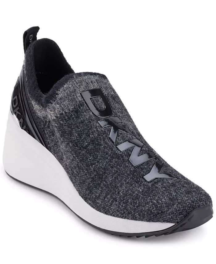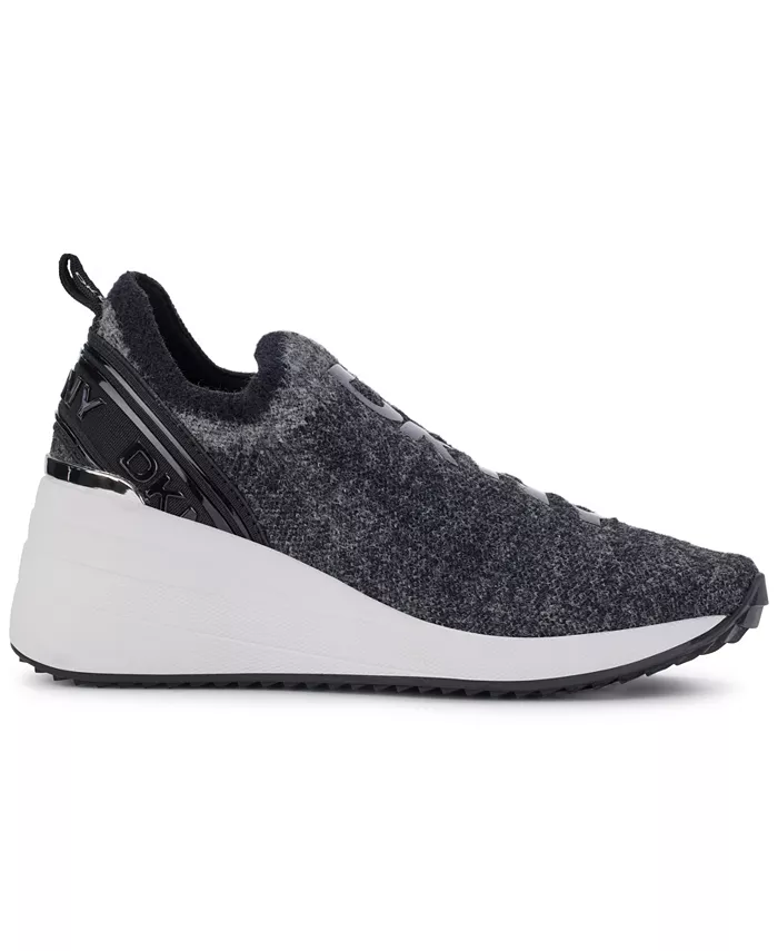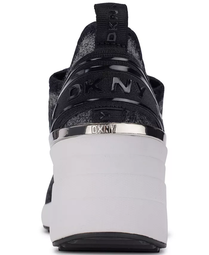Детали с логотипом DKN Women в тон добавляют нотку фирменной изысканности спортивным трикотажным кроссовкам без застежек, подчеркнутым контрастным каблуком-танкеткой.