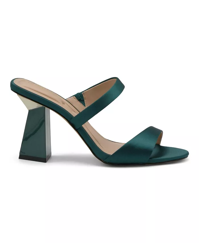 Расклешенный блочный каблук с золотым акцентом подчеркивает стиль этих двухполосных мюлей с ремешками.