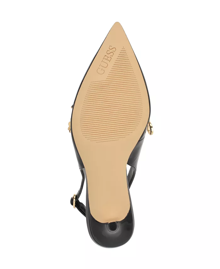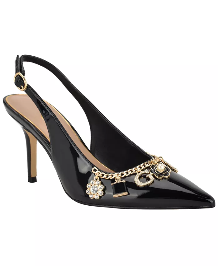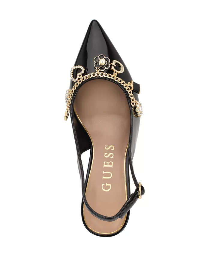 Классические туфли-лодочки с острым носком и открытой пяткой приобретают очаровательный штрих в Naska от Guess. Подчеркнутые цепочкой, подвески Guess дополняют этот образ. Основанный в 1981 году, Guess — это всемирный бренд стиля жизни и символ молодого, авантюрного образа жизни.