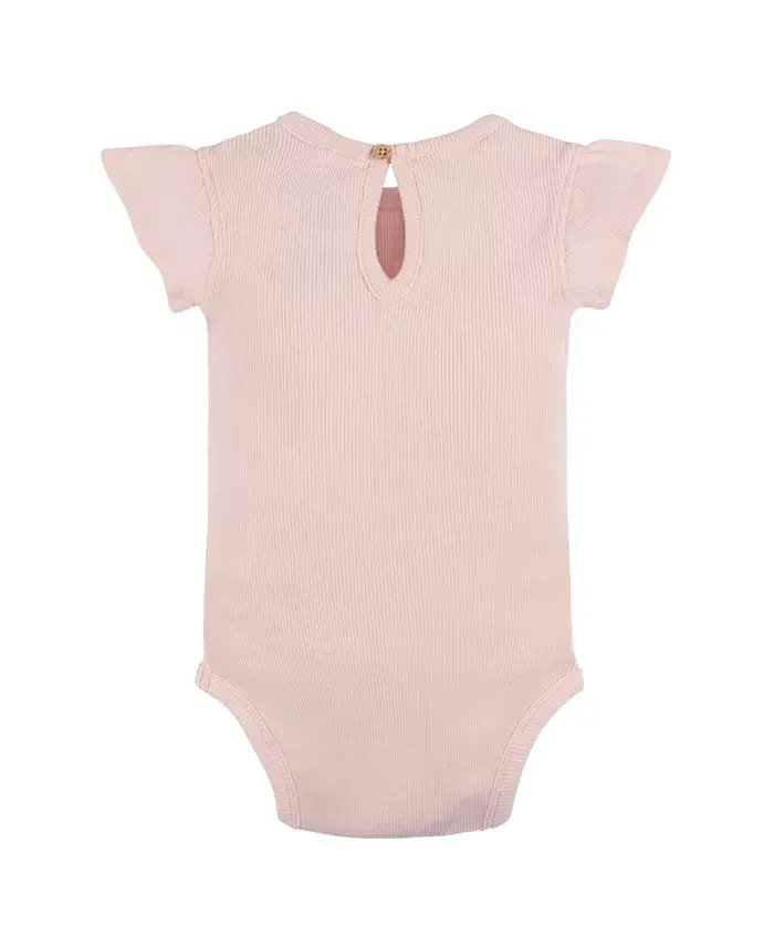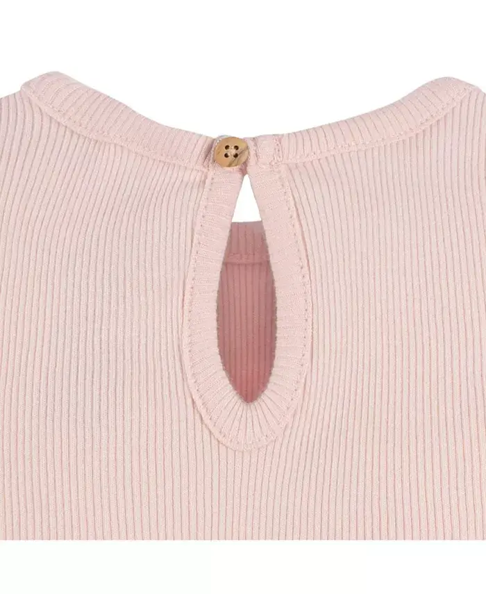 Оденьте свою малышку в этот восхитительный розовый комплект из боди и шорт, который будет мягким и нежным для нежной кожи благодаря 100% хлопковой ткани. Вертикальная резинка боди обеспечивает гибкую посадку, а оборчатые рукава придают ему дополнительную сладость. Удобные застежки на ножках упрощают смену подгузников, а соответствующие шорты имеют удобный эластичный пояс с игривыми оборками для милого, стильного вида. Будь то день на улице или игра дома, этот комплект гарантирует, что ваш ребенок будет чувствовать себя комфортно и очаровательно. Наши основные предметы прошли независимую сертификацию STANDARD 100 от OEKO-TEX, поэтому вам не придется беспокоиться о вредных веществах в гардеробе вашего малыша. Включает один боди с подходящими шортами.