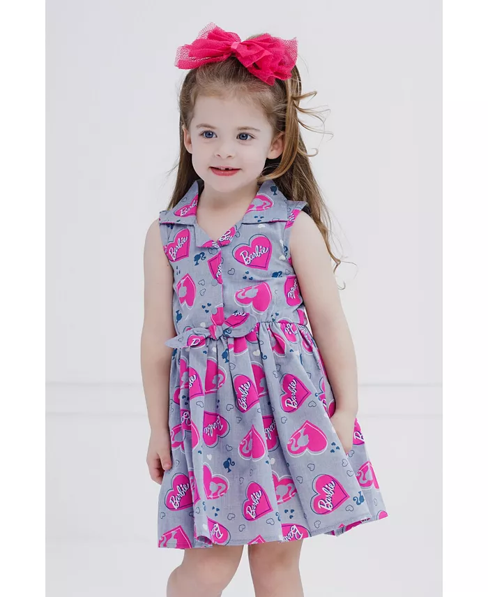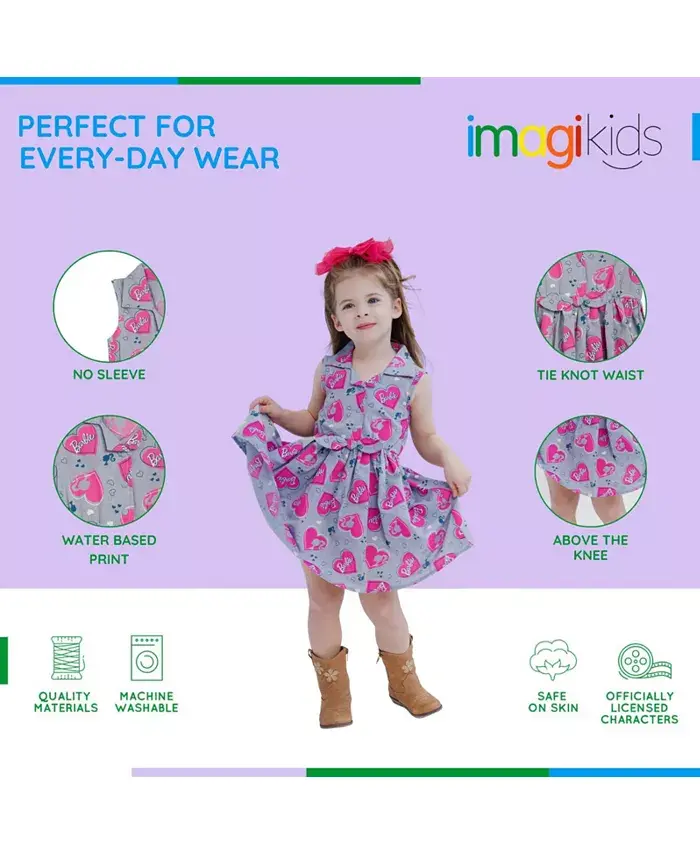 Приготовьтесь к приключениям в Доме Мечты и ощутите удивительное чувство стиля Барби с этим милым и удобным нарядом Барби! Это модное платье без рукавов имеет стильную застежку на пуговицы спереди с воротником, очаровательный бант на талии и классный рисунок логотипа и значка Барби в прет