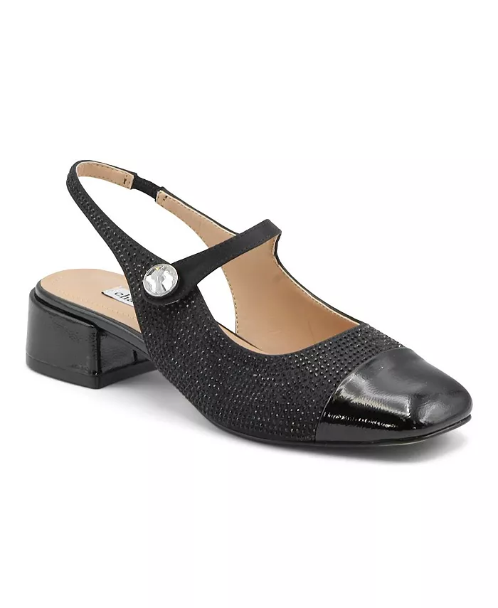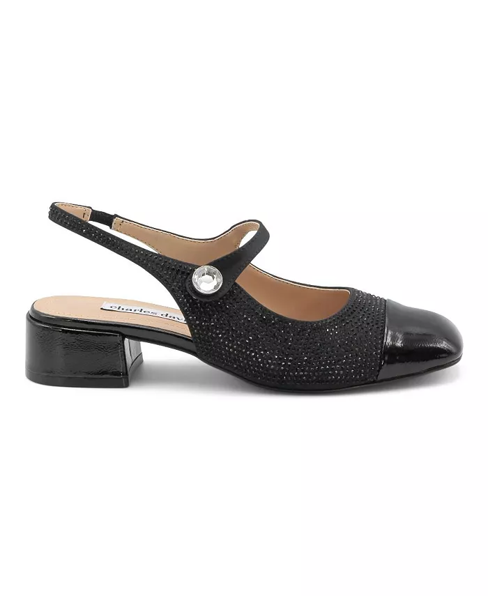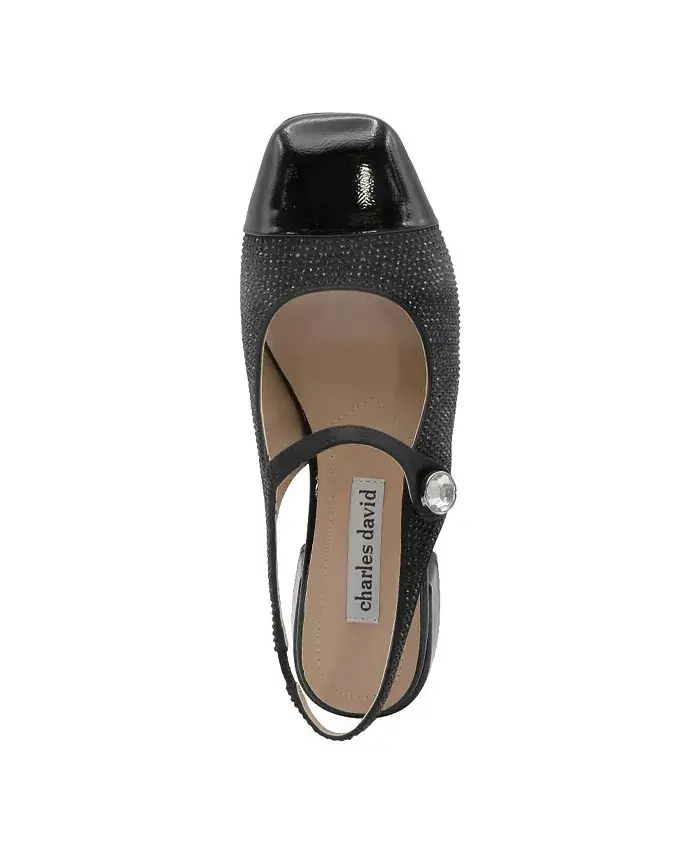 Глянцевый лакированный носок подчеркивает идеально сбалансированную конструкцию туфель-лодочек с открытой пяткой, приподнятых на блочном каблуке.