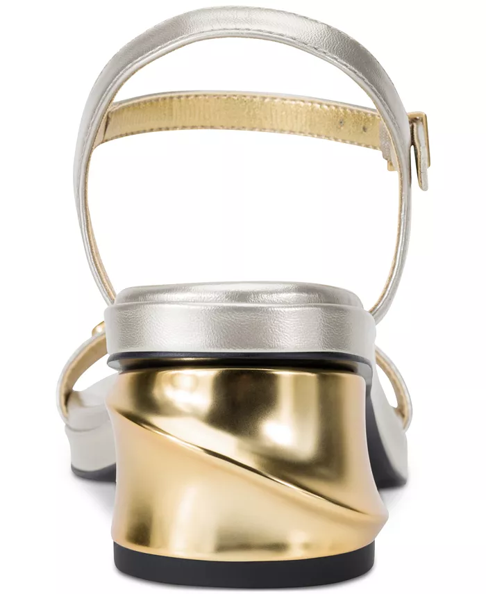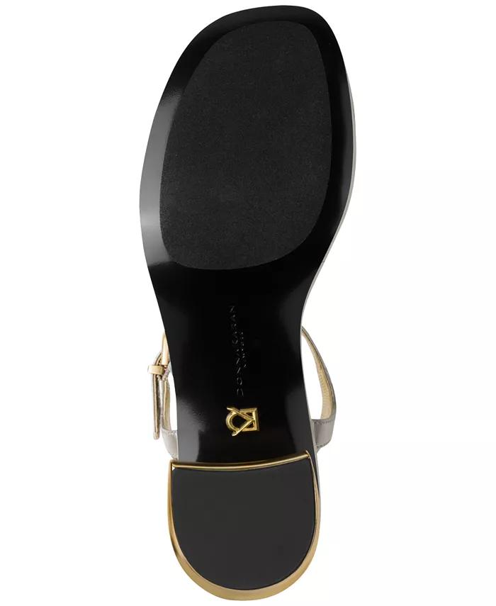 Скульптурные каблуки оттеняют цепочную фурнитуру золотистого оттенка, подчеркивая ваши любимые образы в босоножках Trissa от Donna Karan New York.