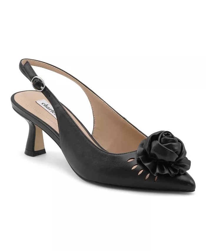 Каблук-рюмочка уравновешивает острый миндалевидный носок с цветочным декором на союзке этих туфель с открытой пяткой, которые станут универсальным дополнением к вашему гардеробу.