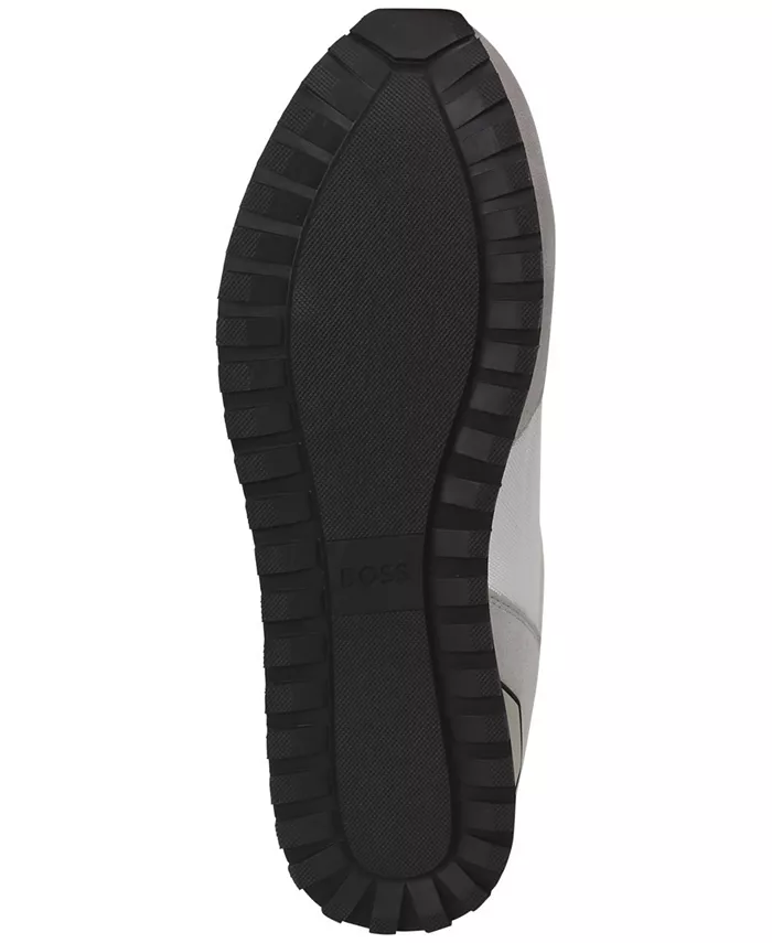 Кроссовки Parkour — это культовые беговые кроссовки BOSS, выполненные из комбинированного материала с элементами из ткани и замши, которые визуально обогащены разноцветной подошвой, спойлером на пятке и строчкой.