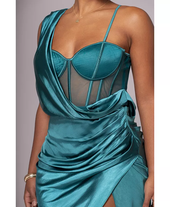 Роскошная атласная ткань для изысканного образа Модель на одно плечо с очаровательной драпировкой на плече для дополнительной элегантности. Сетчатый лиф и разрез на бедре для придания соблазнительности Регулируемые плечевые ремни, подкладка в чашечках и косточки для структуры и поддержки Вечная вещь, которую можно хранить долгие годы 100% полиэстер Ручная стирка Сделано в Китае