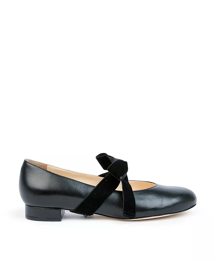 Туфли на низком каблуке с регулируемым бархатным ремешком-бантом.