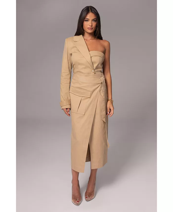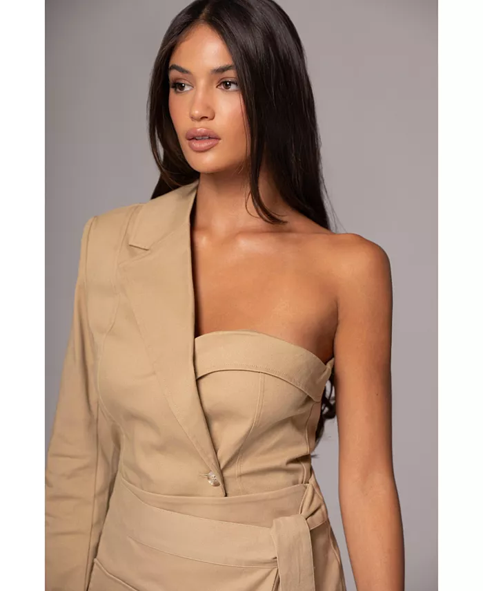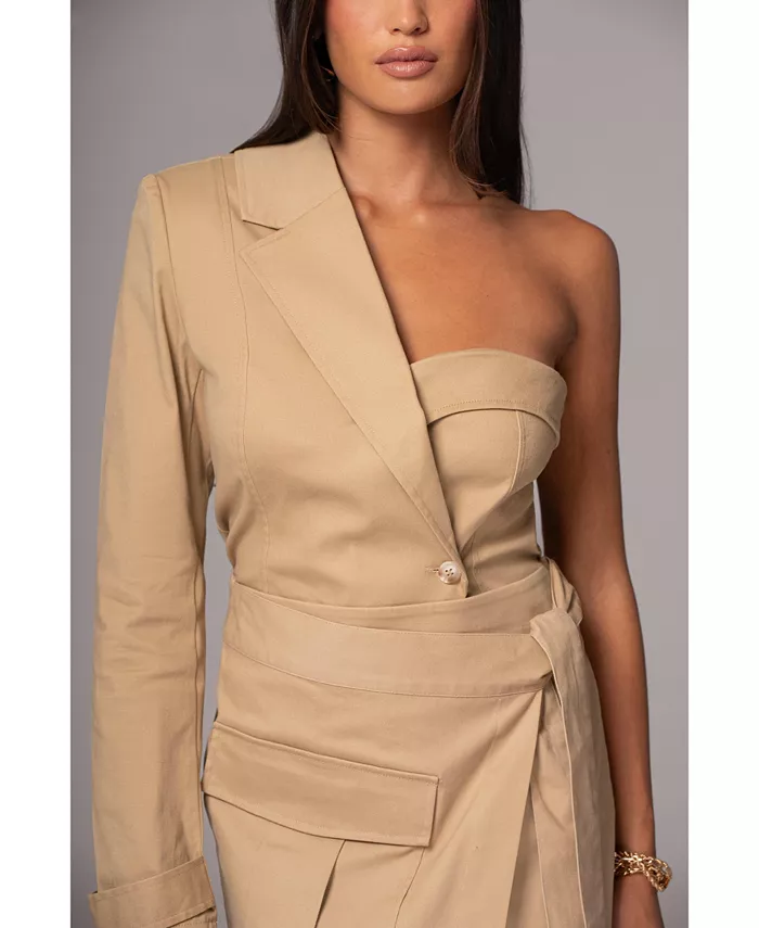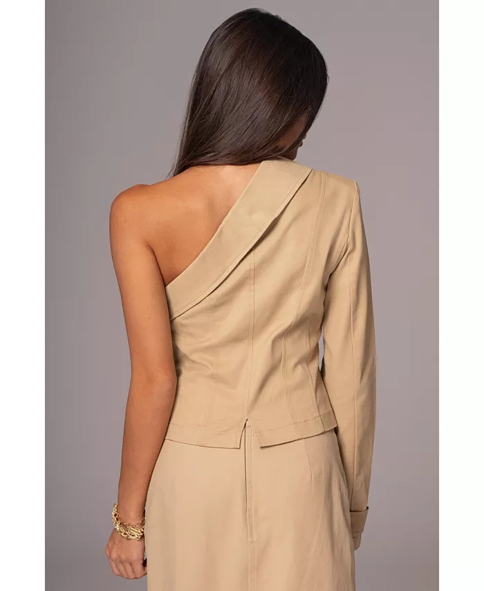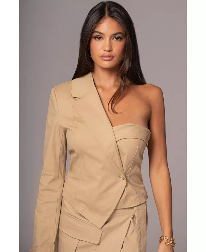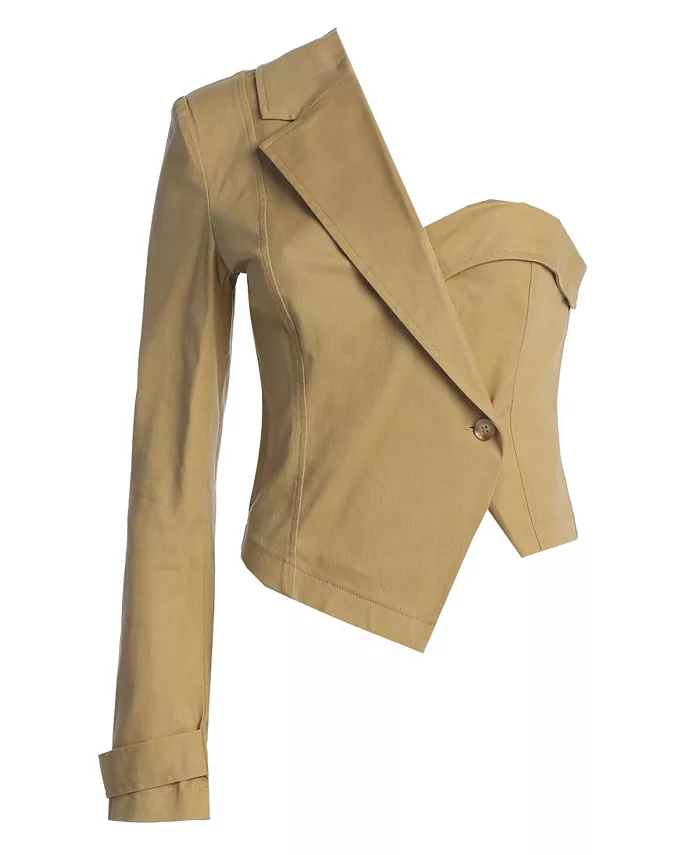 Представляем топ Khaki Amal One Shoulder Top, элегантное дополнение к вашему гардеробу. Этот изысканный топ имеет одно плечо с лацканами, двубортный перед и манжеты на пуговицах. Дополнен подплечниками и мини-разрезом сзади.