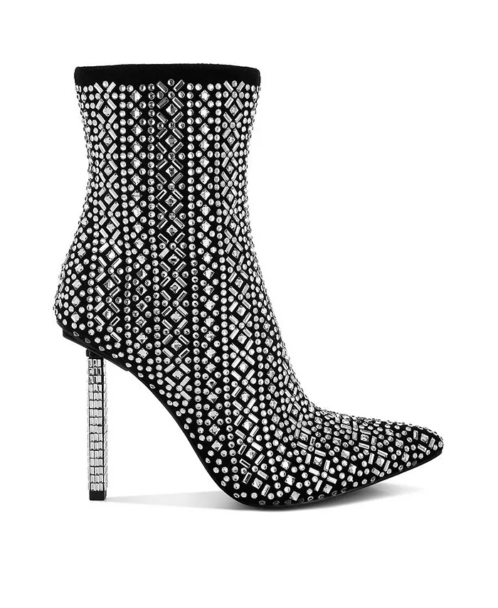 Роскошные, снисходительные, роскошные, встречайте ваши новые сапоги-шпильки длиной до щиколотки. У них мягкий верх из микрофибры и узорчатое украшение из стразов. С боковой застежкой-молнией и 4,5-дюймовым каблуком-шпилем, украшенным стразами, эти сапоги для вечеринок — одна пара, которая скоро станет вашим ценным приобретением.