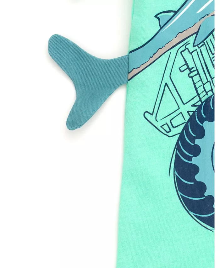 Воротник-лодочка из трикотажной резинки. Потрясающий дизайн с трафаретной печатью. Застежка-липучка. Крутая объемная деталь в виде акульего хвоста на боковом шве.