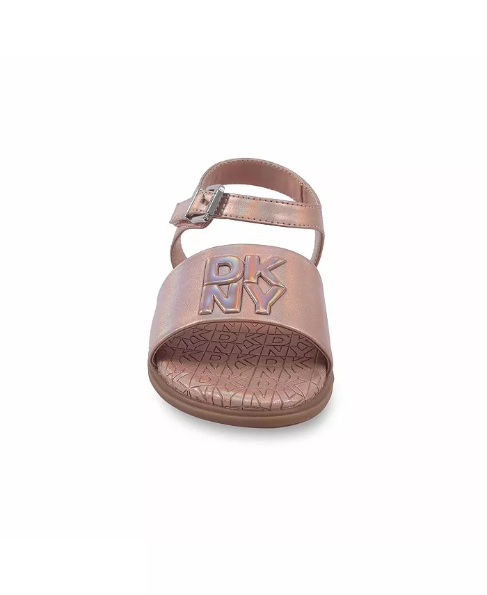 Сандалии DKNY для молодежи. Мягкая стелька с тисненым металлическим логотипом. Застежка на металлическую пряжку. Крупный монохромный логотип.