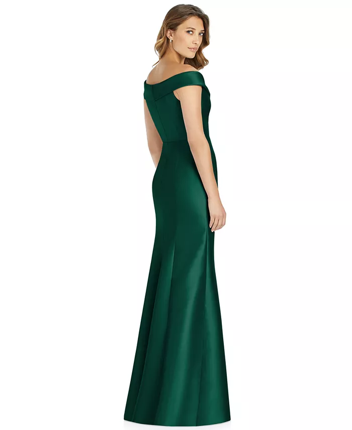 Элегантность легко достигается в этом мерцающем атласном платье от Alfred Sung с вырезом, открывающим плечи, и разрезом спереди до бедра.