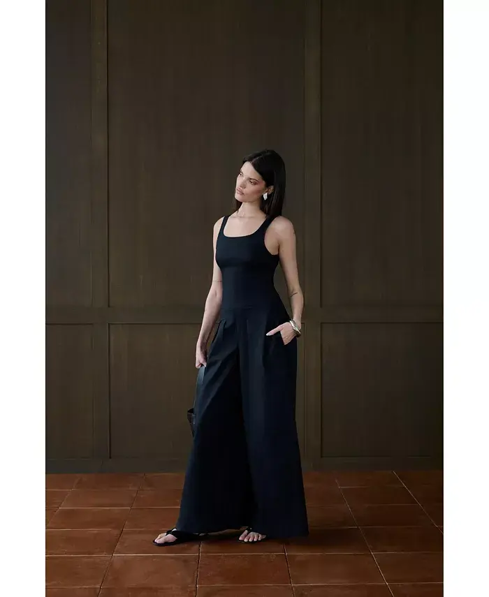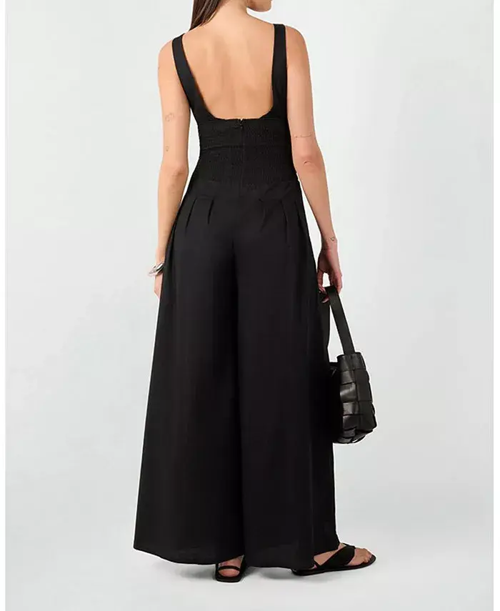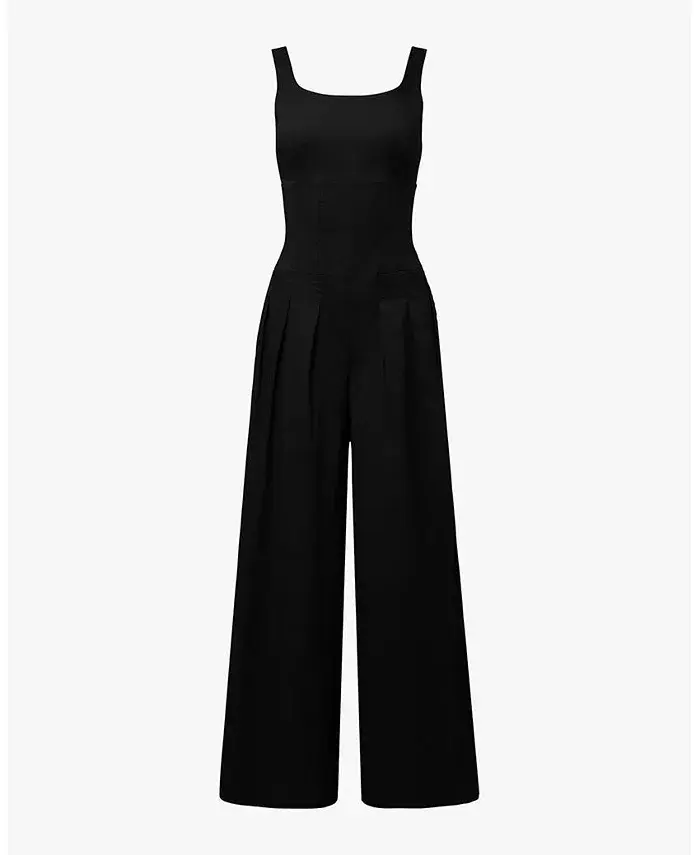Этот плиссированный комбинезон из хлопкового поплина с широкими штанинами имеет корсетный лиф с квадратным вырезом, ажурные швы и присборенную спинку для создания приталенной талии.