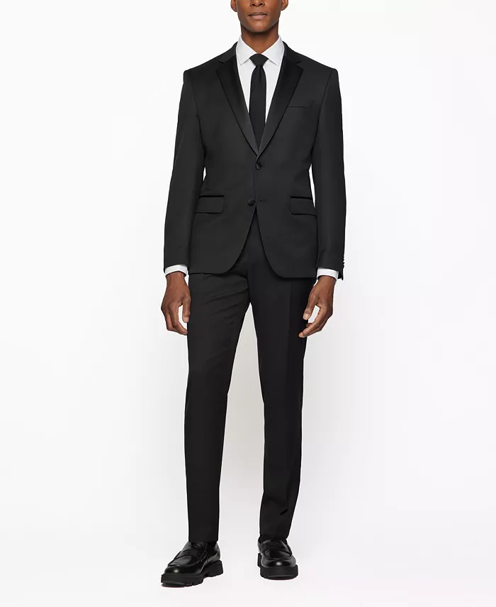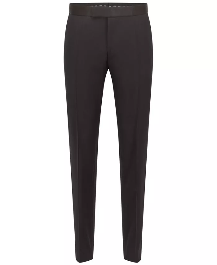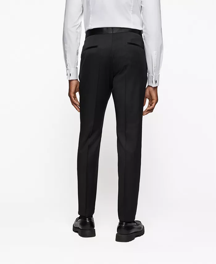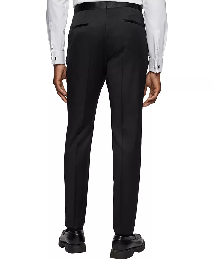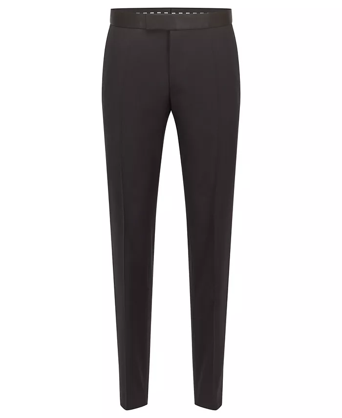 Вечные брюки от BOSS menswear. Эти брюки с отделкой тональными акцентами из шелковой смеси для создания образа смокинга выполнены из саржевой ткани.