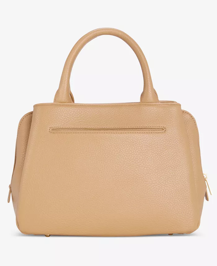 Золотистая фурнитура и логотип, внешний накладной карман сзади, внутреннее центральное отделение на молнии, карманы на молнии и накладные карманы