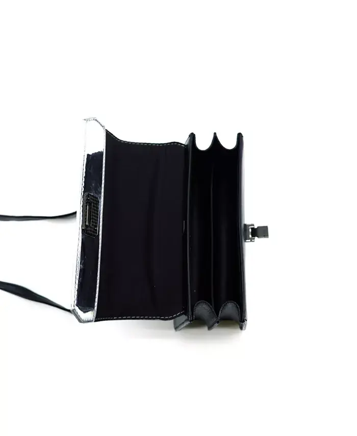 Нестареющая квадратная сумка через плечо, разработанная с ноткой авангарда с металлическим верхним клапаном и резинкой для переноски сверху. Компактное внутреннее пространство для хранения необходимых вещей, идеально подходит для неформального свидания или вечернего выхода.
